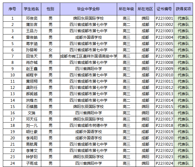 四川省2022年第39届全国中学生物理竞赛复赛省队名单