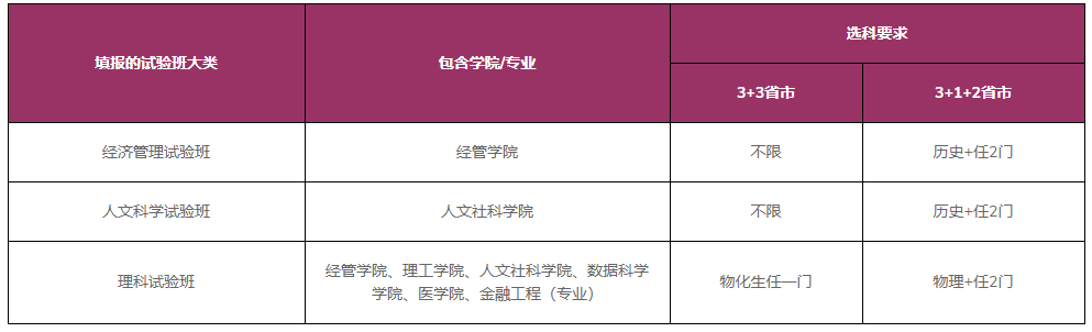 (三)理科试验班:本试验班为经管学院、理工学院、人文社科学院、数据科学学院、医学院(含临床医学专业)及金融工程专业联合招生。学生在大一报到后选课前充分了解各学院及专业优势,再根据个人兴趣和特长自主选定所属学院(有意向就读金融工程或临床医学专业的学生需直接选定)。非金融工程或临床医学专业的学生,大一结束时在所属学院内选定主修专业。