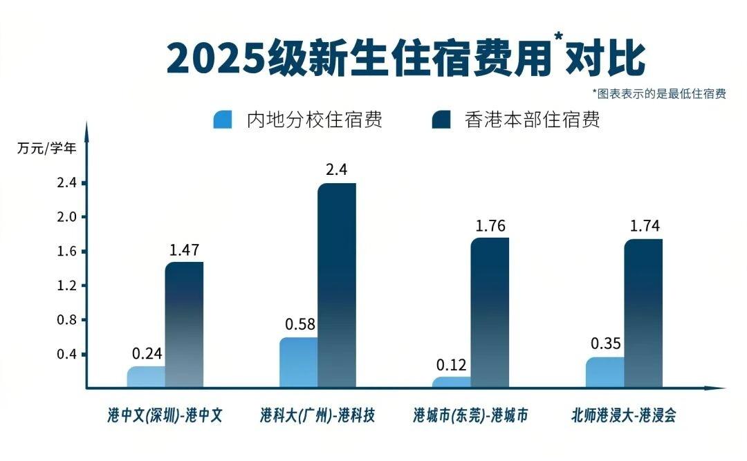 除了学费,内地分校的住宿费更是具有压倒性优势。四所分校集体把宿舍费普遍控制在7000元以下,即使最贵的北师港浸大(6400元/年)仍不到香港最低档的一半,还不会遭遇宿舍资源紧张问题。