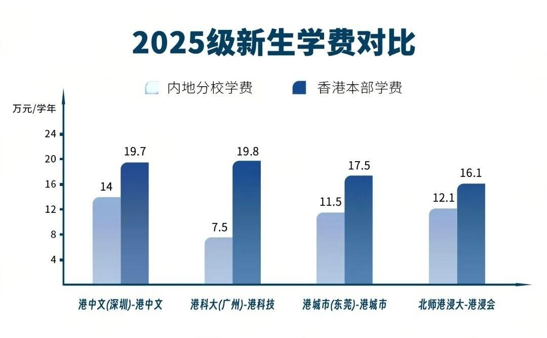 数据显示,港校内地分校确实是名副其实的“性价比之选”。其学费不仅低于上海纽约大学、西交利物浦大学等一线中外合办大学;相比香港本校更是大幅降低(普遍低约30%-50%),其中港科大(广州)的学费甚至仅为香港本部的一半左右,让学生能以更低的成本获得港校的优质教育资源。