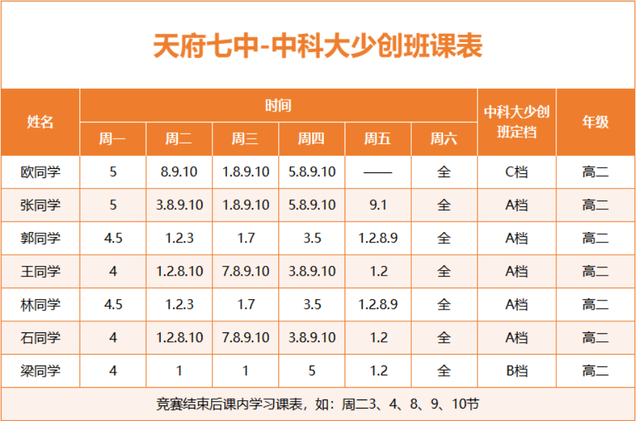 少年班(少创班)除了需要通过三个阶段的校测,还要高考达到相应的分数线,对于高一高二的同学们,特别需要平衡常规课程与专项学习时间。周一到周五,同学们可以根据自己竞赛学习和综合课程学习以及校内课程安排学习,周六基本上需要全天投入竞赛和专项课程学习。周日进行复习消化并且安排一些休息时间。下列课程表是去年天府七中报考中科大少创班拿到A/B/C档资格的考生们的时间安排,大家可以参考: