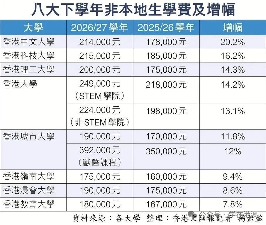 从已公布的数据来看,八大高校的学费均有不同程度上调。其中,香港中文大学涨幅最高,达20.2%,学费由178,000港元增至214,000港元;香港科技大学紧随其后,涨幅16.2%,学费升至215,000港元。涨幅超过14%的还包括香港理工大学(14.3%)与香港大学(STEM学院14.2%,非STEM学院13.1%)。相比之下,香港岭南大学(9.4%)、香港浸会大学(8.6%)和香港教育大学(7.8%)的涨幅较为温和,显示各校在定价策略上的差异。