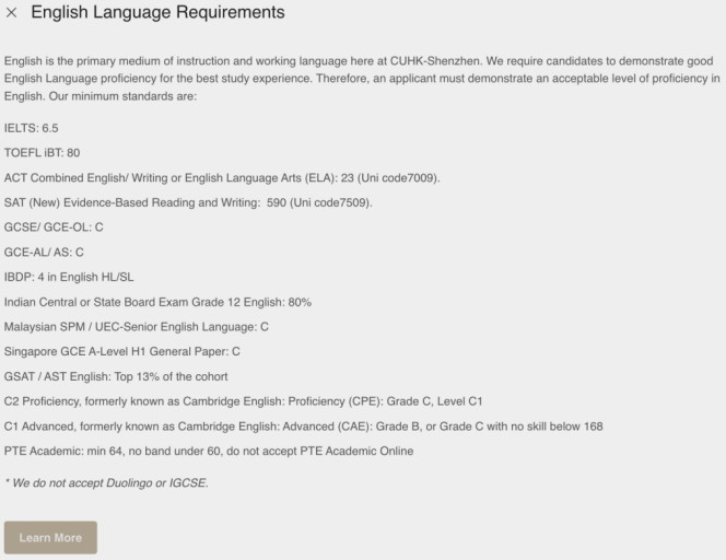 在国际学生的录取上,港中深的门槛也是最高的。最低入学要求是总分排名前20%,核心科目(数学、英语及与专业直接相关的科目)也要在前20%以内;雅思最低6.5,托福至少80分。