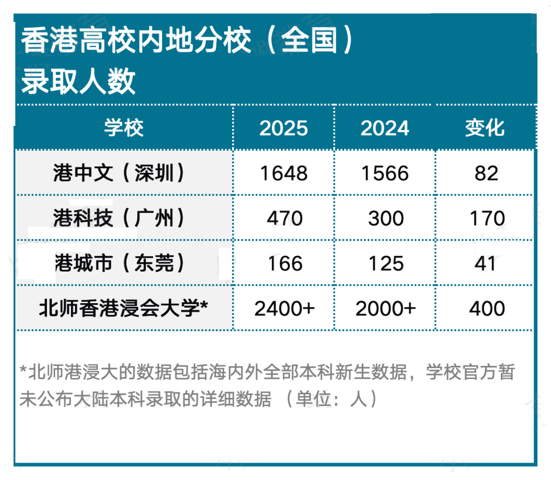 而北师港浸大的整体招生人数从2000+抬到了2400+。但官方未单列内地生占比,自主选拔在线认为有一种可能,是想用海外与港澳台的生源对冲内地竞争压力,以规模换生存空间。但从该校2024年共录取了301名内地高考生,较2023年有明显的扩招推测,今年可能内地录取人数仍有增加。推测一下,这四所学校在未来两年若维持当前节奏,港校内地版图的生源体量将迅速突破5000关口,真正从“小而美”走向“大而强”。