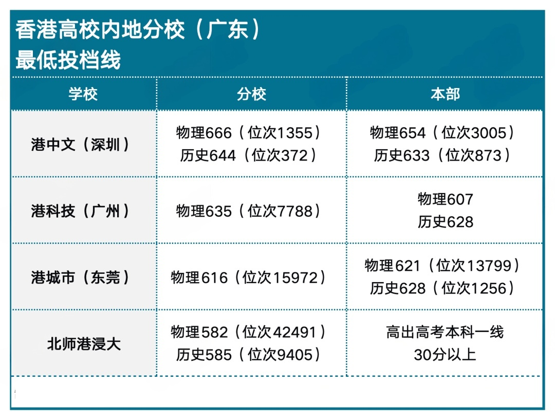 此外,在与香港本校的分数线对比中,也可以看出港校内地分校在大湾区的“吸引力”正在提升,且有明显分层。港中深已形成稳定的品牌吸引力,今年物理类666分、历史类644分的最低投档线全面超越本部(物理654分/历史633分),位次也显著前移。不少广东尖子生用分数投票,更倾向于选择深圳校区。