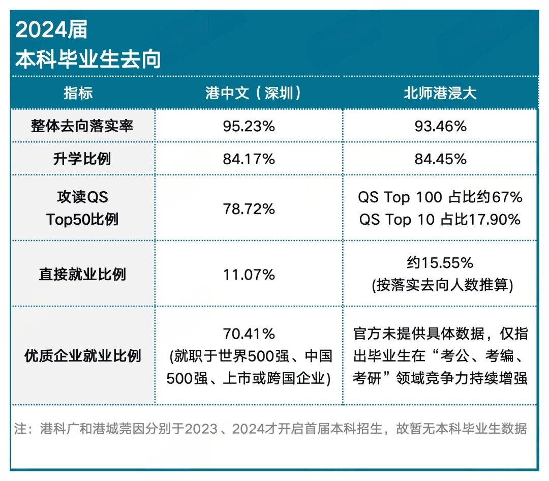 然而,费用也只是一个因素,真正的价值需要通过升学、就业等教育回报来衡量。毕业生去向数据显示,港校内地分校在升学方面表现突出。港中深有78.72%的毕业生进入QS TOP50深造,与“港系精英”标签绑定;北师港浸大则有1,157人(占比67%)送进QS TOP100,其中17.9%被Top10顶尖学府录取,这些学校确实提供了优质的升学平台。就业方面,港中深仅11%的人选择直接工作,直接就业的毕业生中,有七成以上进入了世界/中国500强企业,平均年薪17万起步,走的是“少而精”路线;北师港浸约16%的就业比例略高,具体就业数据尚未完全公开。