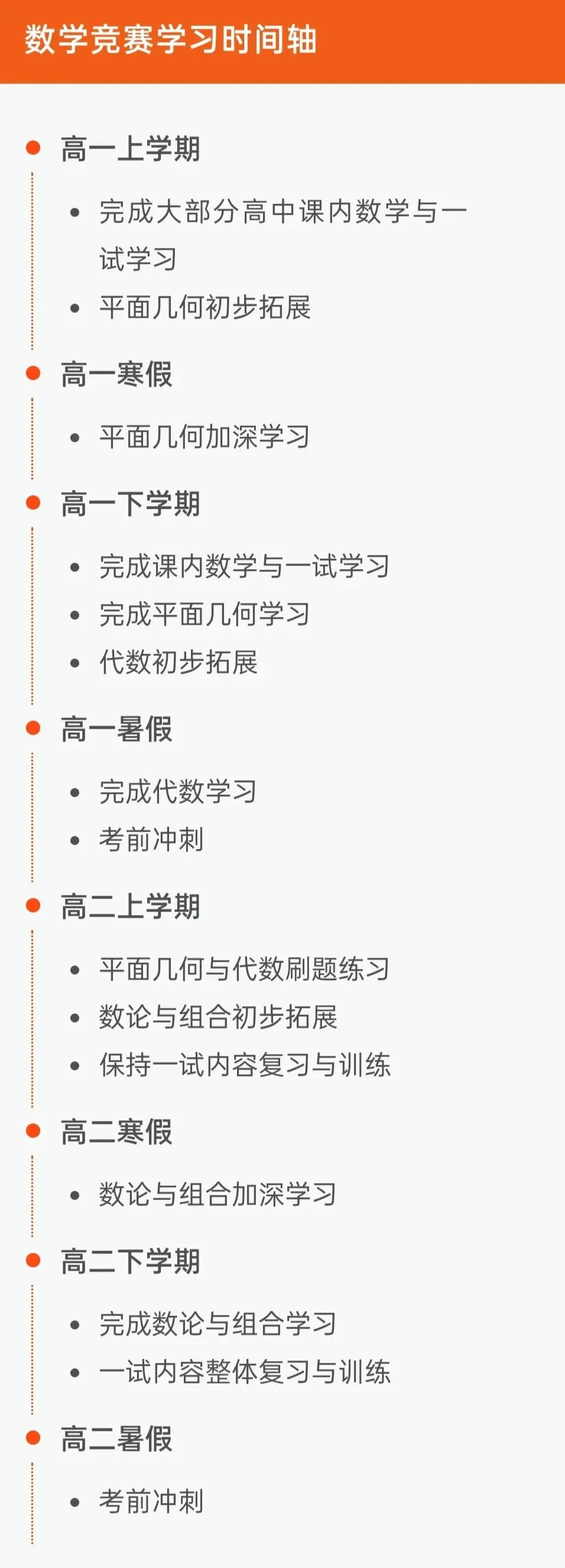 无论目标大小,想要实现都需要制定详细的学习计划,以下是根据竞赛老师们的个人经验整理的学习时间轴,同学们在参考的同时,可根据自身学习状态适当调整。