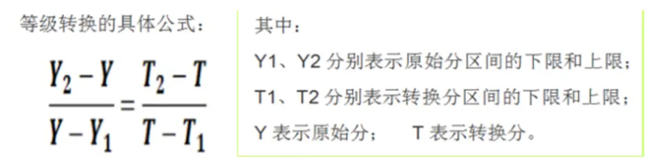 确定了赋分区间后,再根据等级换算公式计算出等级赋分后的分数,公式为: