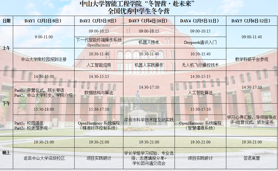 3.冬令营活动说明:“冬智营·赴未来”人工智能训练营由中山大学智能工程学院主办,依托本院优质师资团队,并特邀行业资深专家共同打造的官方培训项目,未授权或委托任何第三方机构开展教学培训工作。