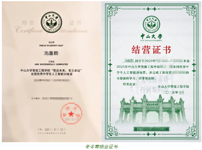 斩获中山大学官方结业证书、中山大学智能工程学院冬令营结业证书(双证),留存编程作品、校园纪念周边(保温杯、纪念衫、笔记本)等成长印记。