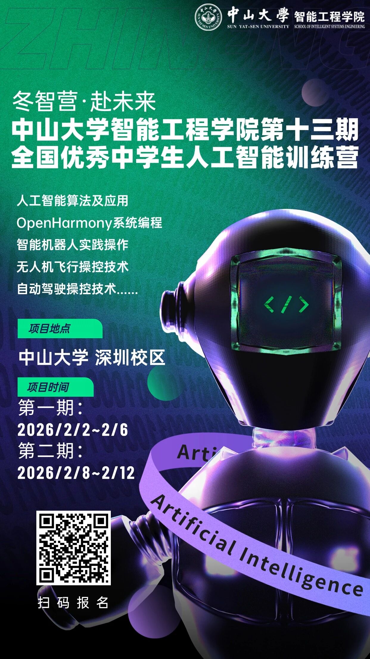 中山大学智能工程学院将于2026年举办全国优秀中学生冬令营,此次活动分为两期进行,现面向全国优秀中学生开放报名,报名截止日期为2026年1月25日。欢迎有志于智能工程领域的青年才俊踊跃报名参加,共同体验学术魅力,探索未来科技!以下是本次冬令营的详细信息,请广大考生留意。