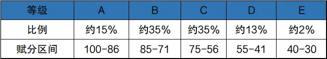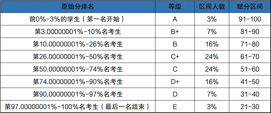 在等级赋分制度下,考生的成绩会根据其原始的分值来确定在全省人数中所占的比例,例如某新高考省份的考生A成绩为85分,在全省排名占比前15%以内,参考下面的赋分制度,可以得知A所在的赋分区间为100-86。